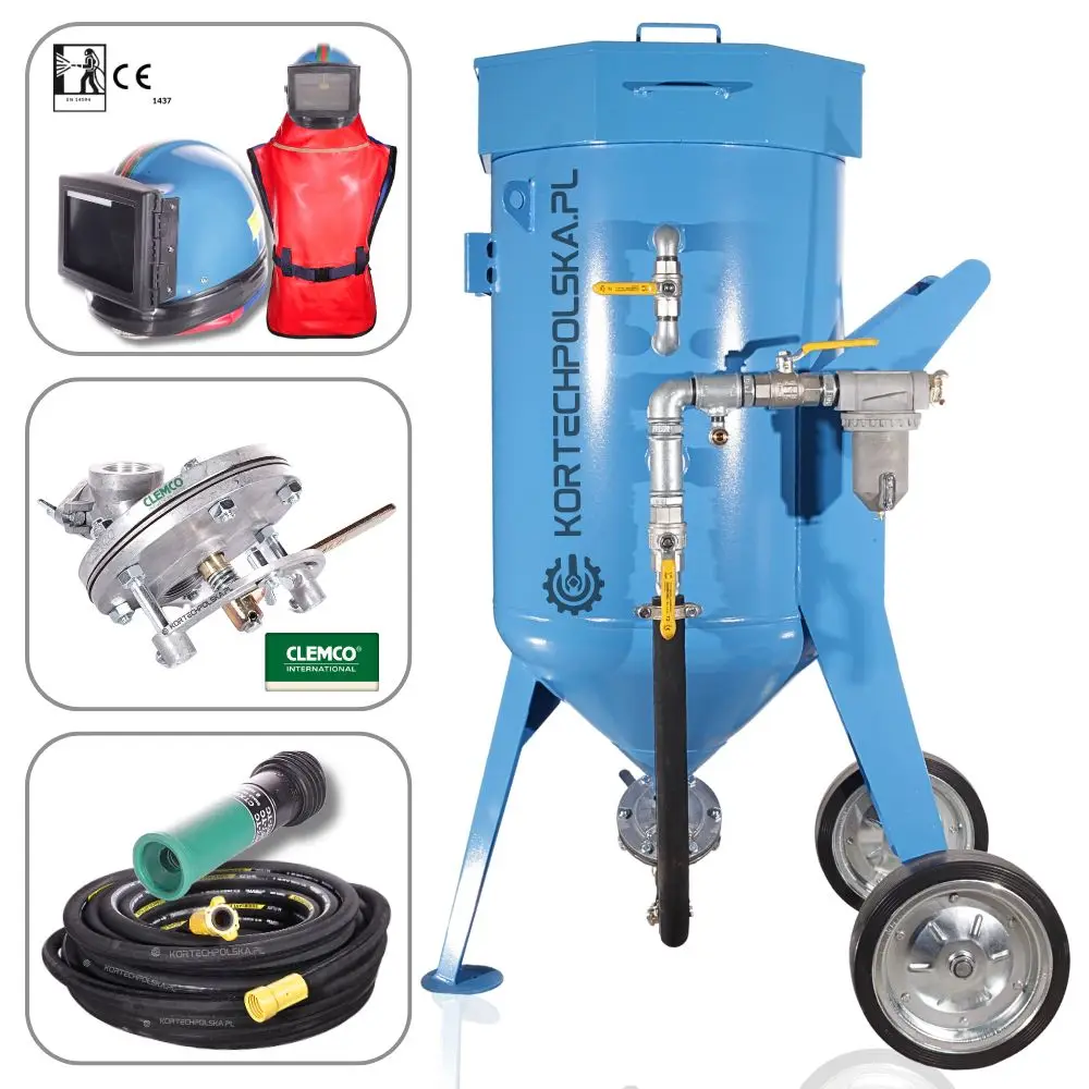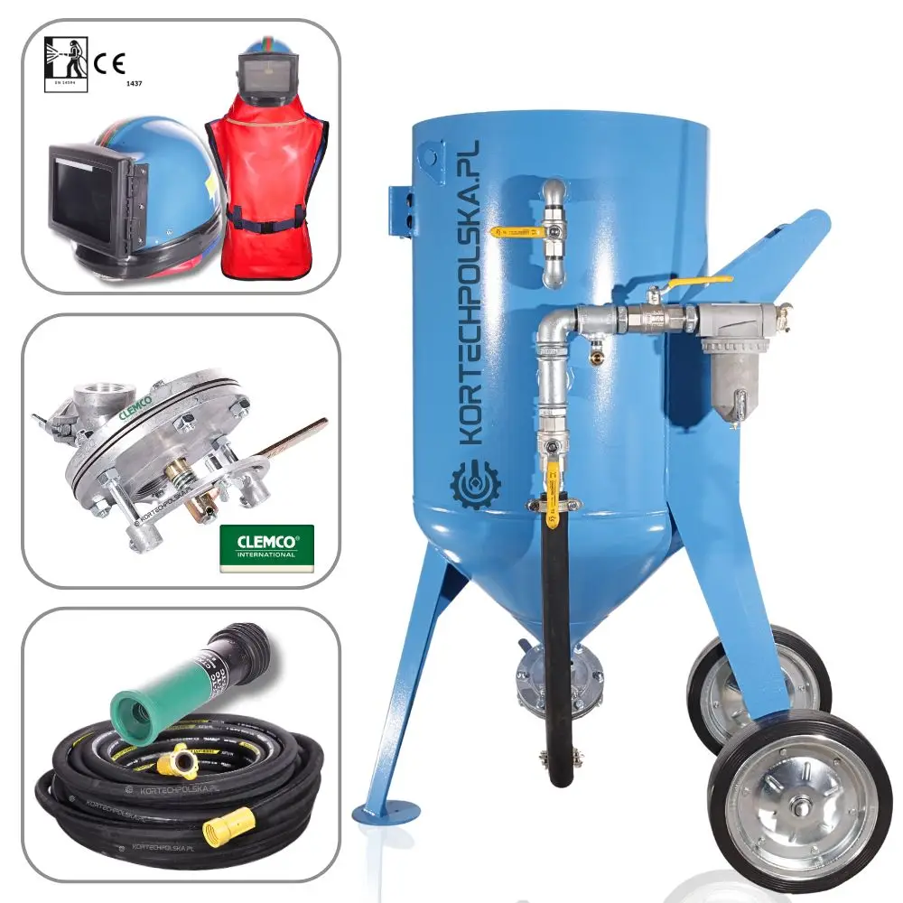 Oczyszczarka wyposażona jest min. w znormalizowane złącze kłowe (szybka i bezpieczna wymiana węża roboczego). W oferowanym zestawie znajdą Państwo dyszę o średnicy od 4,8mm do 8 mm (do wyboru) CLEMCO, wąż roboczy wraz ze złączami CQP-1 i NHP-1, profesjonalny hełm dla piaskarza RES-3 z prostokątnym wizjerem oraz wężem do oddychania. Dołączony filtr oddechowy wraz z reduktorem ciśnienia pozwala na precyzyjne dozowanie powietrza docierającego do hełmu. Istnieje możliwość dowolnego dobrania długości węża, 10m, 20m, 30m, 40m.